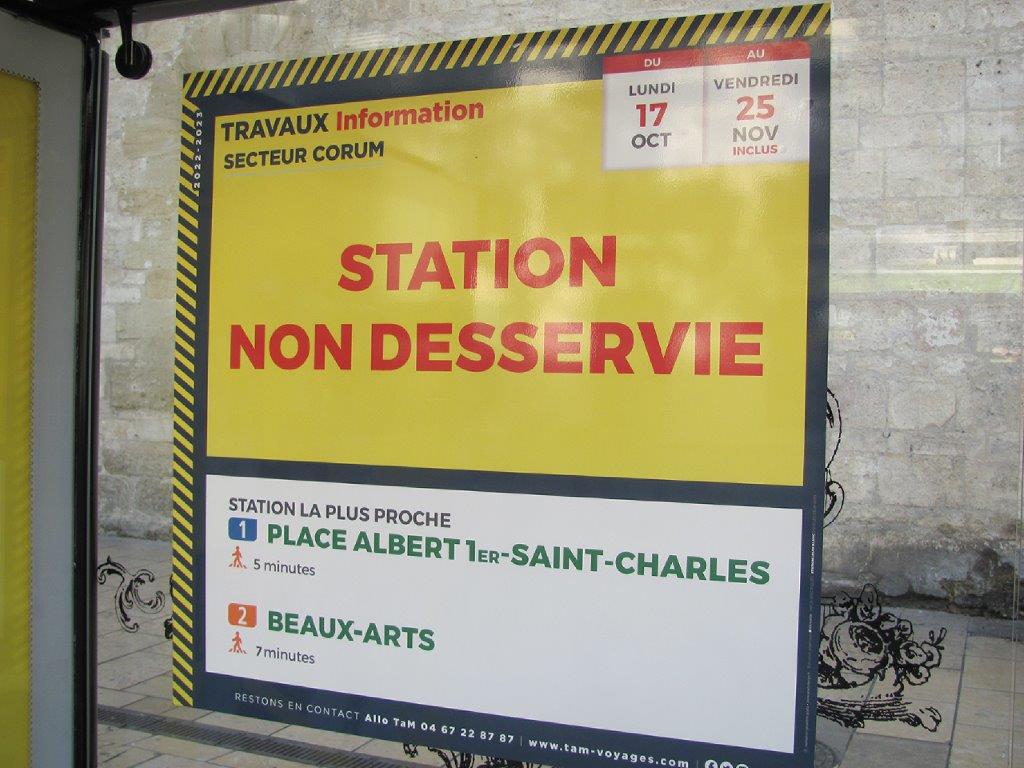 En raison de travaux de voies dans le secteur Corum à Montpellier, les rames opérant sur la ligne 1, comme ici la rame 2007 Citadis 401 Alstom, ont desservi la station « Observatoire » du lundi 29 août 2022 au vendredi 25 novembre 2022, date de la photo. Copyright : Edouard Paris