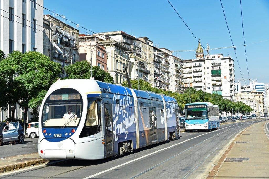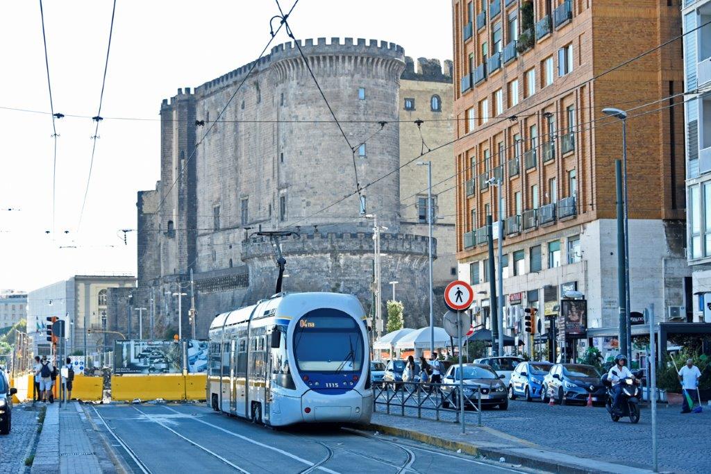 Surprise ! Alors que le service des lignes 1 et 2 aurait dû reprendre ce jour-là après plus d’un mois de suspension pour cause de travaux de maintenance des voies communes aux lignes 1 et 2 sur le cours Giuseppe Garibaldi sur une portion de 200 m de long située entre la place Guglielmo Pepe et la station « Garibaldi – Circumvesuviana », seule la ligne 4 fonctionnait avec une fréquence de passage apparemment renforcée puisqu’il a été possible d’immortaliser 8 rames Sirio AnsaldoBreda en l’espace de 50 minutes, parmi les 22 unités de même type numérotées 1101 à 1121 livrées en 2004 et 1122 réceptionnée en 2006 qui compose à ce jour le parc roulant du réseau de tramways napolitain.