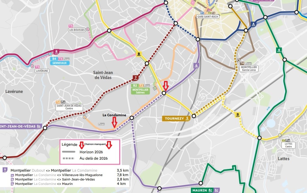 Tant que la continuité de la future véloligne montpelliéraine 6 ne sera pas effective entre la station « La Condamine » de la ligne 2 de tramway à Saint-Jean-de-Védas et l’avenue du Colonel André-Pavelet à Montpellier, il y a fort à parier que les cyclistes n’hésiteront pas à monter à bord des rames de tramway avec leur monture aussi bien à la station « La Condamine » à l’aller qu’à la station « Sabines » au retour, alors qu’aux heures de pointe les rames opérant sur la section de ligne 2 à voie unique entre « Saint Jean de Védas – Centre » et « Sabines » sont particulièrement bondées.