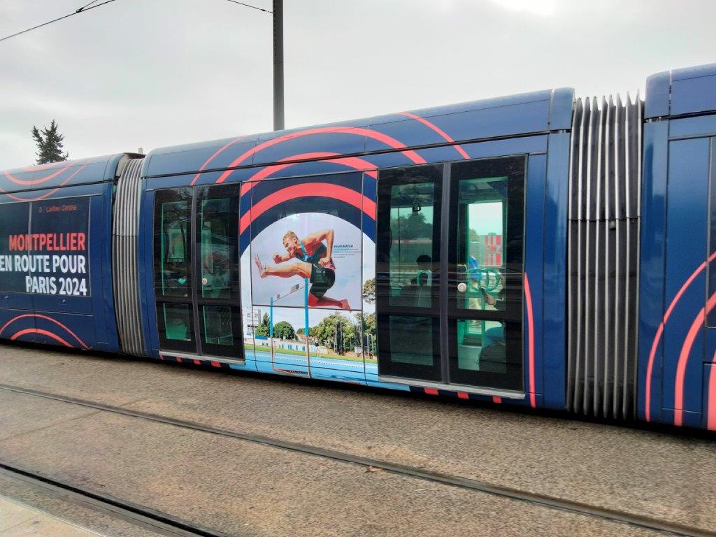 Des portraits d’athlètes montpellierains, susceptibles de participer aux Jeux Olympiques de Paris 2024, ornent les faces latérales des modules intermédiaires de la rame 2099, dont celui de Kévin Mayer, double champion du monde, double vice-champion olympique et recordman du monde de décathlon.