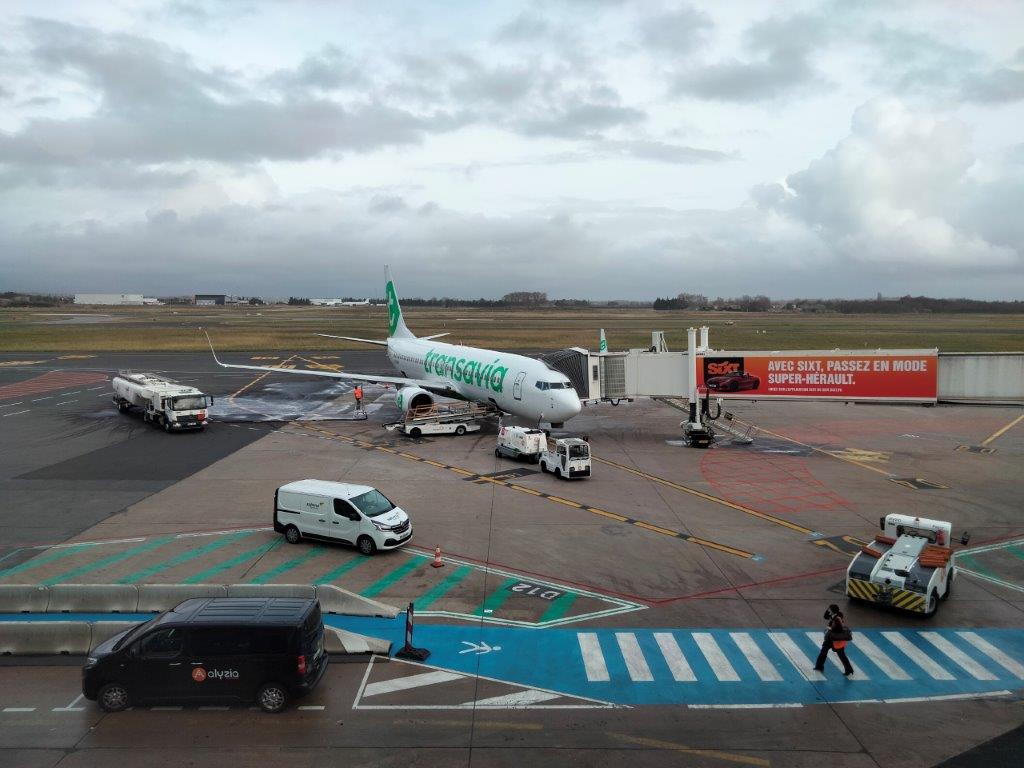 Le Boeing 737-800 de la compagnie Transavia, immatriculé F-GZHT, est photographié sur le tarmac de l’aéroport Montpellier Méditerranée, le lundi 19 décembre 2022. Copyright : Edouard Paris