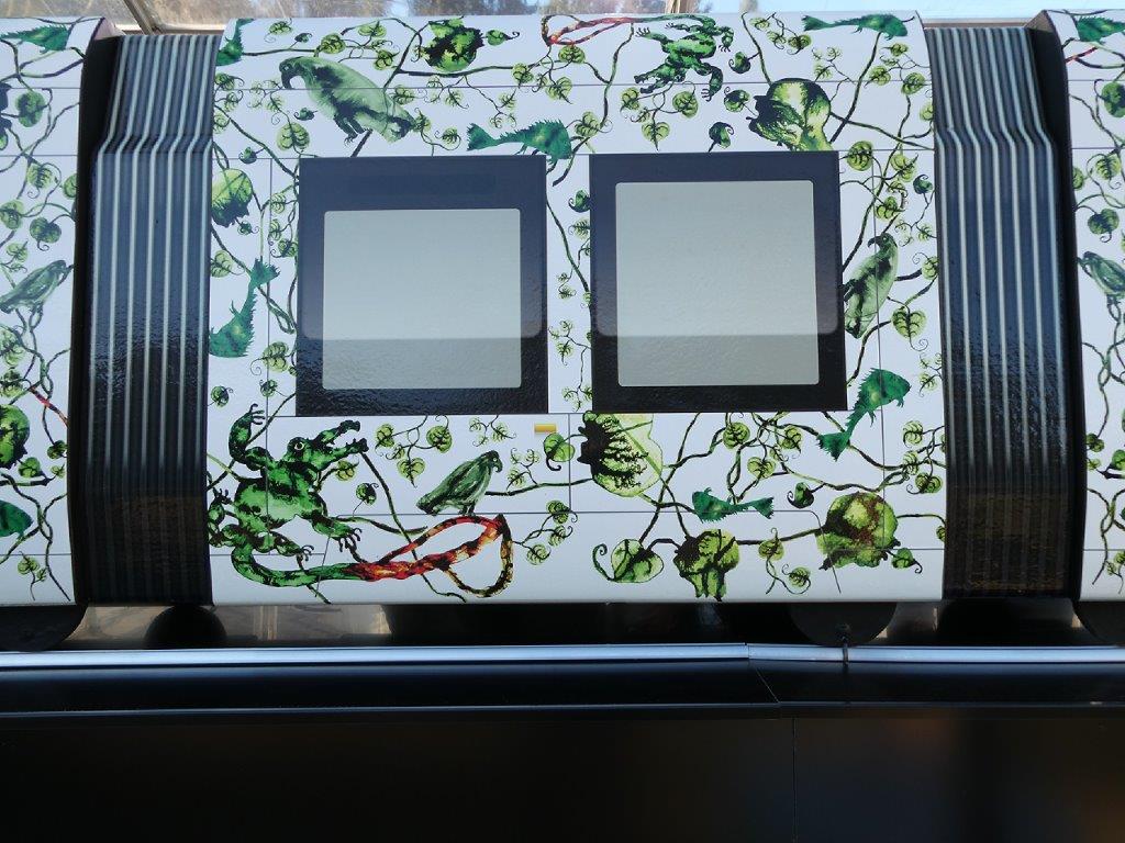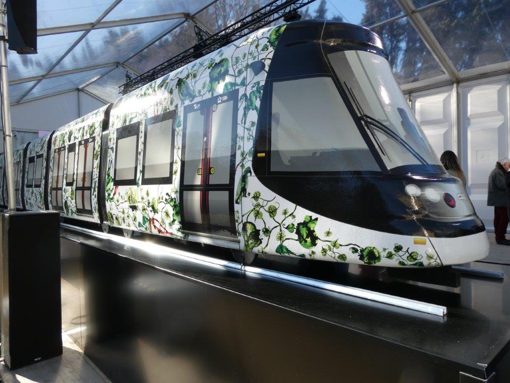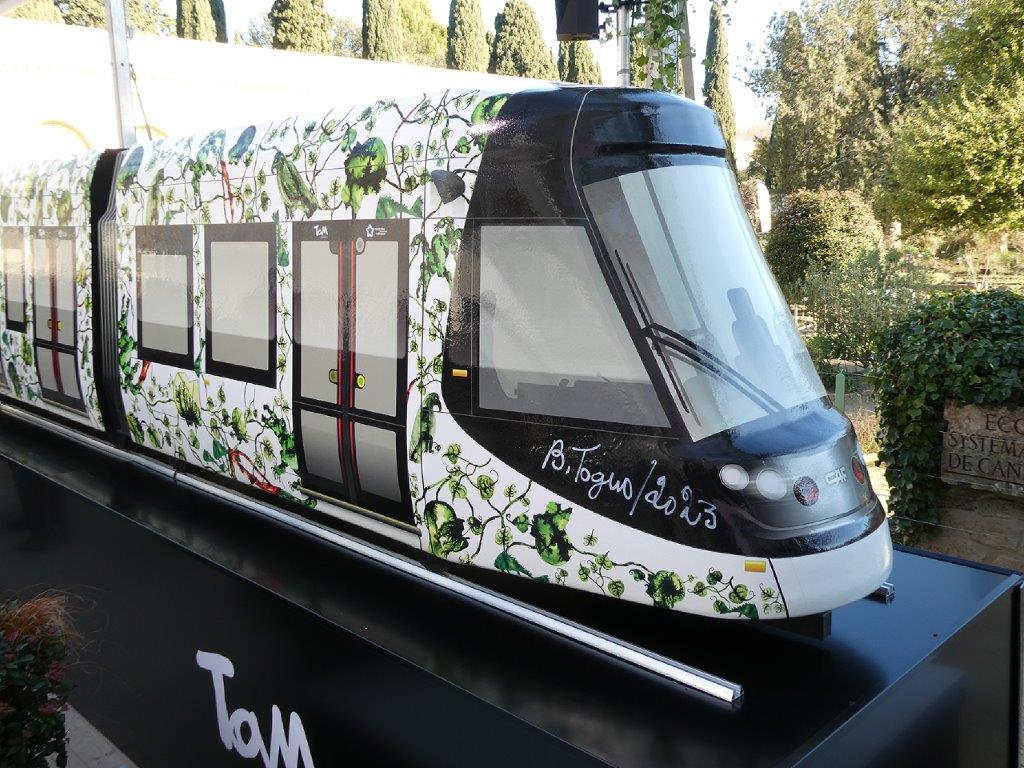 Au lendemain de la cérémonie officielle de dévoilement du design de la future ligne 5 de tramway, qui reliera d’ici la fin de l’année 2025 le rond-point Maurice-Gennevaux à l’ouest, à cheval sur les communes de Saint-Jean-de-Védas et Montpellier, au rond-point de Girac au nord, situé sur la commune de Clapiers, via le centre-ville de Montpellier, le grand public était convié à découvrir à son tour la maquette de la rame montpelliéraine Urbos 100X CAF revêtue de la livrée ligne « Feuille de vie » conçue par l’artiste camerounais Barthélémy Toguo, ce samedi 21 janvier 2023 au jardin des plantes de Montpellier.