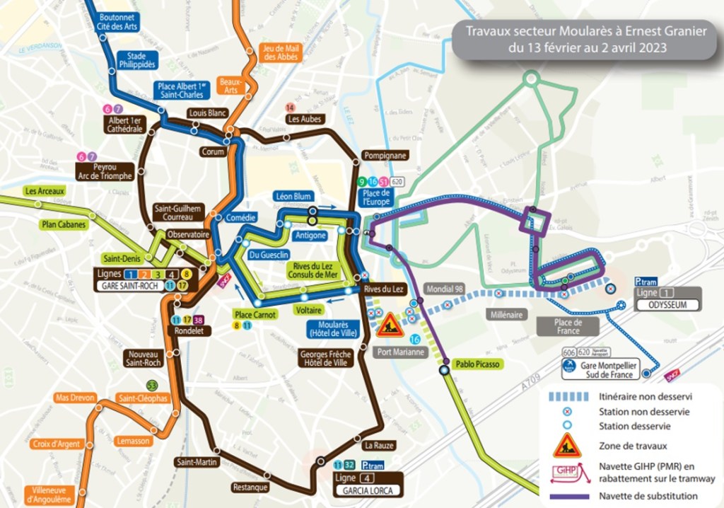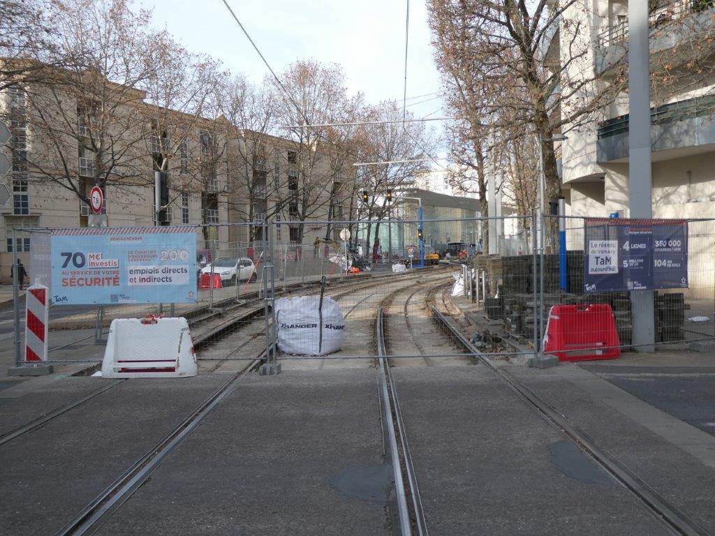 En attendant la prochaine phase de travaux et ses conséquences, dont tout un chacun peut avoir un aperçu ci-dessus, la ligne 4 de tramway est neutralisée dans les deux sens sur son trajet le plus court entre les stations « La Rauze » et « Pompignane » du lundi 2 janvier au dimanche 12 février 2023. Durant cette même période, la ligne 1 de tramway est déviée dans les deux sens entre les stations « Gare Saint-Roch » et « Moularès (Hôtel de Ville) » via les stations propres à la ligne 3 : « Place Carnot », « Voltaire » et « Rives du Lez – Consuls de Mer ».