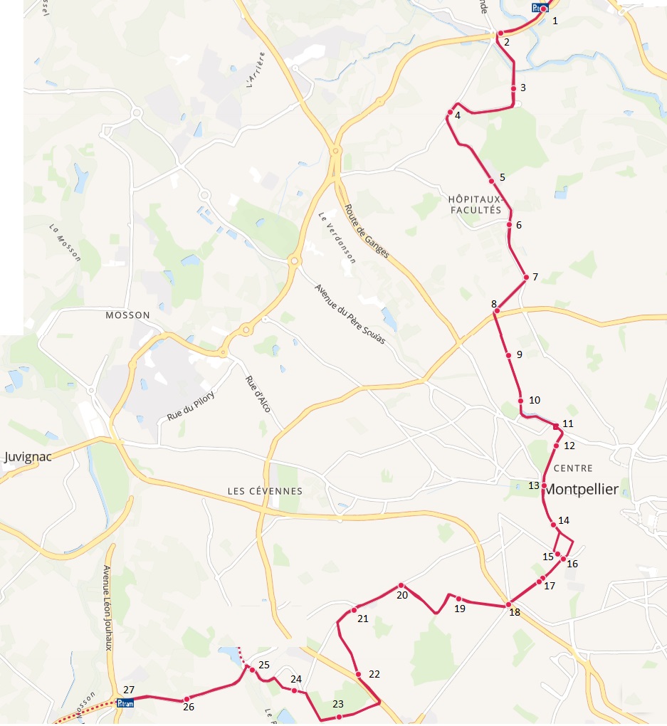 Concernant l’arrêt n° 5, je suis très surpris d’y voir apparaître « Zoo de Lunaret » alors que l’entrée du zoo est quasiment à 1km. Personnellement, je m’attendais plutôt à ce que ce soit l’arrêt Agropolis qui serve de desserte au Zoo, avec la création d’une nouvelle entrée à proximité de celui-ci. Là on dirait un nouvel arrêt « Pompignane ».