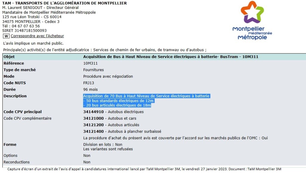 Dans le cadre du projet de la mise en service de cinq lignes de bus à haut niveau de service, désignées BusTram, sur le territoire de Montpellier Méditerranée Métropole en 2025, TaM Montpellier 3M, agissant en qualité de mandataire de la Métropole, vient de lancer un avis d’appel à candidatures international pour l’acquisition de bus à plancher surbaissé 100 % électriques équipés de batteries, dont 50 standards (12 mètres) et 20 articulés (18 mètres).