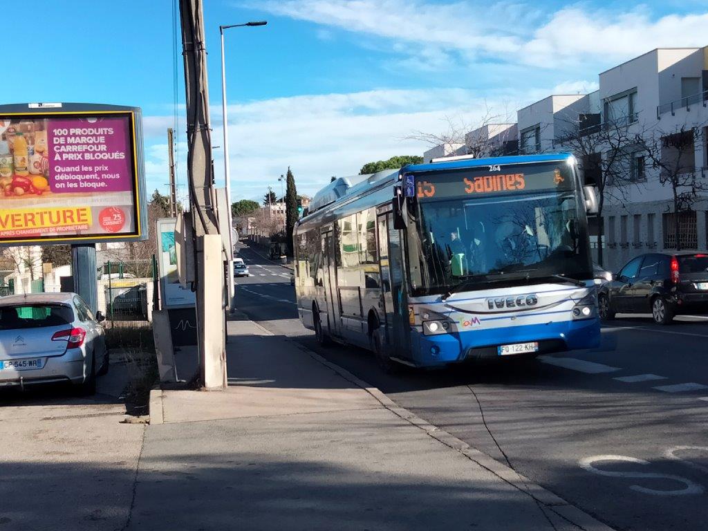Photographie du bus 264 Urbanway 12 GNV IVECO, opérant sur la ligne 15 en direction du terminus « Sabines », rue Paul-Rimbaud à Montpellier, entre les arrêts « Jean Calvin » et « Belvédère », le mardi 17 janvier 2023. Dans le futur, la ligne 15 sera remplacée par la ligne 2 de BusTram et son exploitation sera assurée par des bus articulés 100 % électriques équipés de batteries. Copyright : Edouard Paris