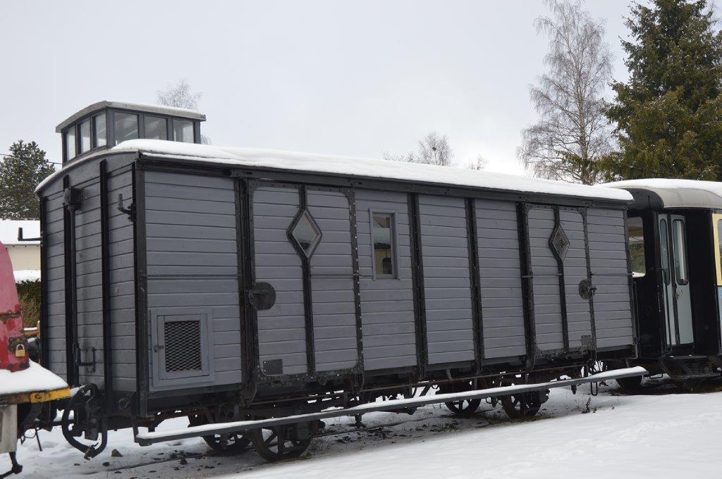 Façade de la gare de Raucoules-Brossettes du Velay-Express photographiée côté quai et voies ferrées devant laquelle stationne une voiture voyageurs à bogies ex-Chemins de fer Rhétiques (RhB), le mardi 31 janvier 2023. Copyright : FraPom