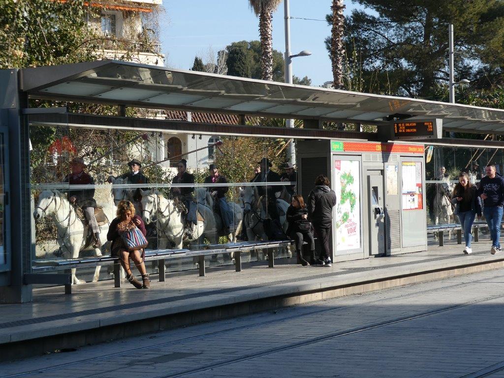 Sur son chemin, le cortège équestre, précédé par des motards de la police municipale, un tracteur agricole et des dizaines de manifestants, a emprunté une contre-allée parallèle au quai « Jacou » de la station « Corum » de la ligne 2, avant de traverser les deux voies ferrées en courbe serrée de cette même ligne, non sans avoir dû céder le passage à la rame 2048 Citadis 302 Alstom multiligne circulant en direction du terminus intermédiaire « Sabines », dont le conducteur ne se doutait pas de se retrouver nez à nez avec des chevaux, qui sur le coup ont été un tant soit peu effrayés. Le cortège a ensuite remonté la partie de la rue du Faubourg-de-Nîmes qui longe la plateforme tramway du tronc commun des lignes 1 et 4, a franchi une secondes fois, sans encombre, des voies ferrées à la hauteur du boulevard Louis-Blanc, et a poursuivi par le boulevard de Bonne-Nouvelle dernière ligne droite avant le lieu de rendez-vous du rassemblement.