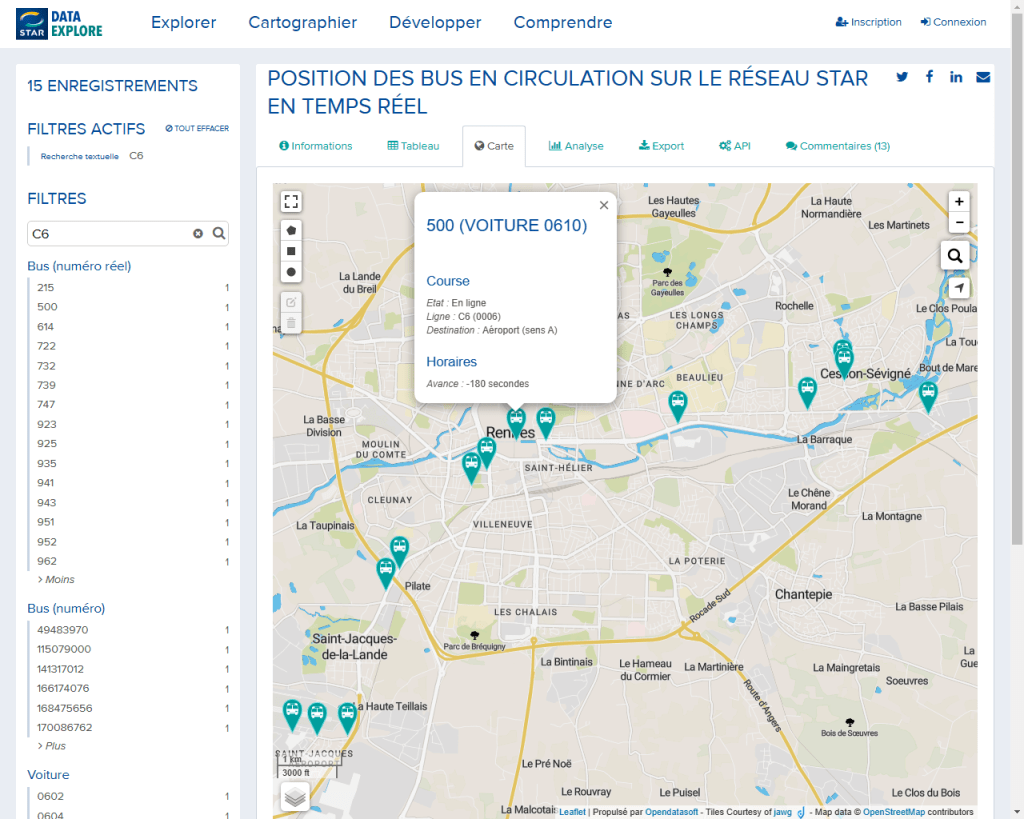 Si vous avez la curiosité de choisir la ligne C6, qui relie dans les deux sens l’aéroport Rennes Bretagne, situé sur la commune de Saint-Jacques-de-la-Lande, à Cesson-Sévigné (Rigourdière), via la place de la République à Rennes, à l’onglet « Tableau » vous découvrirez le nombre et les numéros des bus en service sur cette ligne, et à l’onglet « Carte » le positionnement approximatif de chaque bus, le tout à l’instant de votre recherche. Pour avoir expérimenté l’application en direct pour la ligne C2, l’auteur de la présente info a constaté qu’il existe en général un décalage entre la position indiquée à l’onglet « Carte » et la position réelle du bus. Avant de lancer une nouvelle recherche, il y a lieu de cliquer sur « Tout effacer » de la fonction « Filtres Actifs » en haut de la colonne de gauche.