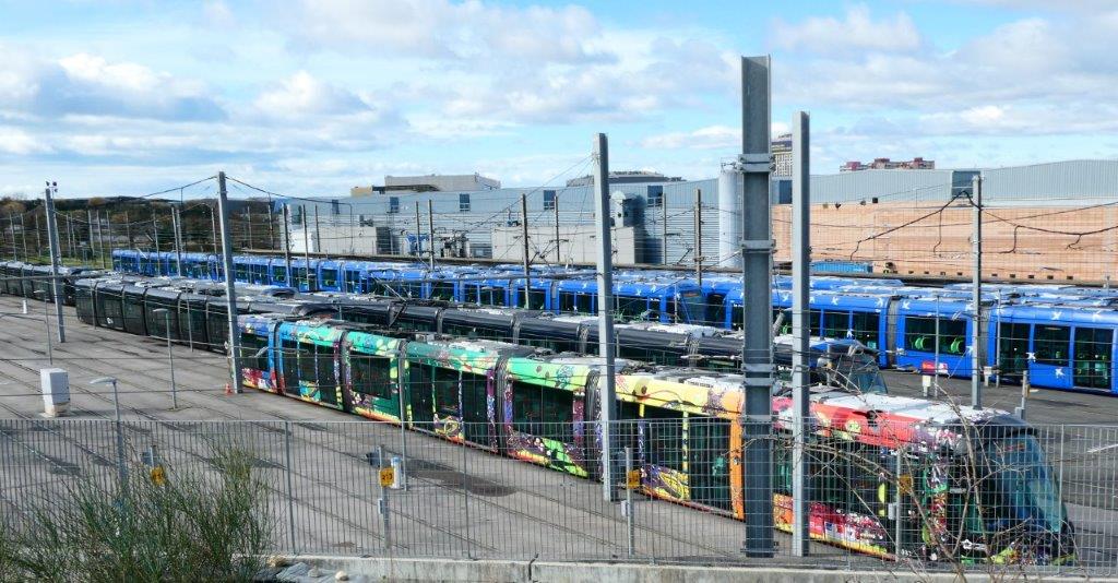 Vue partielle de la zone de remisage extérieure des rames des lignes 1 et 3 du centre d’exploitation et de maintenance « Les Hirondelles », quartier Mosson à Montpellier, le samedi 11 mars 2023. Copyright : Edouard Paris