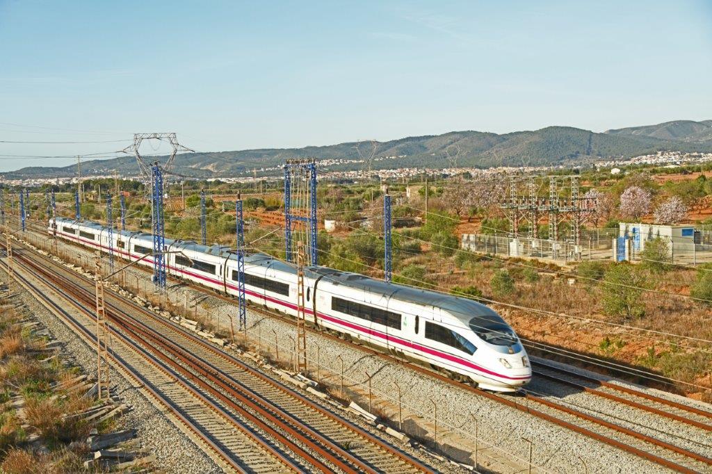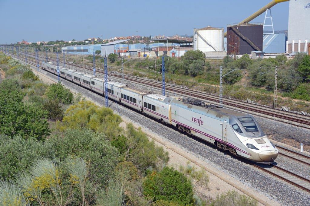 Photos ci-dessus réalisées à L’Arboç, entre Barcelone et Tarragone, le mardi 17 mai 2022 en ce qui concerne les quatre premières et le mercredi 15 mars 2023 pour ce qui est des suivantes. La ligne à grande vitesse est équipée de voies à écartement UIC de 1 435 mm et de catenaires alimentées en courant monophasé 25 Kv 50 Hz, alors que la ligne classique, qui la longe, est équipée de voies à écartement espagnol de 1 668 mm et de caténaires alimentées en courant continu 3 000 V. Que ce soit sur la ligne à grande vitesse que sur la ligne classique, les trains roulent à droite. Copyright : Thierry Leleu