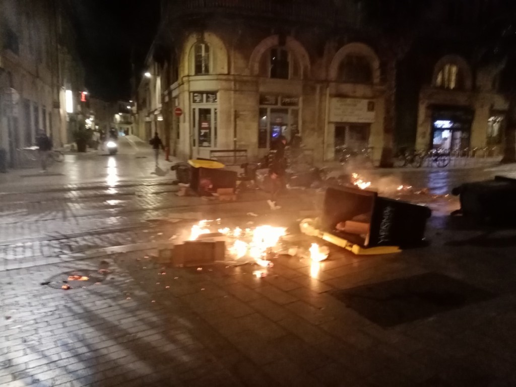 Feux de détritus et containers renversés sur les voies de la ligne 4 de tramway, boulevard du Jeu-de-Paume à Montpellier, à la hauteur de la rue Saint-Guilhem et de la rue du Faubourg-du-Courreau, le lundi 20 mars 2023 à 21h23. Copyright : Miguel
