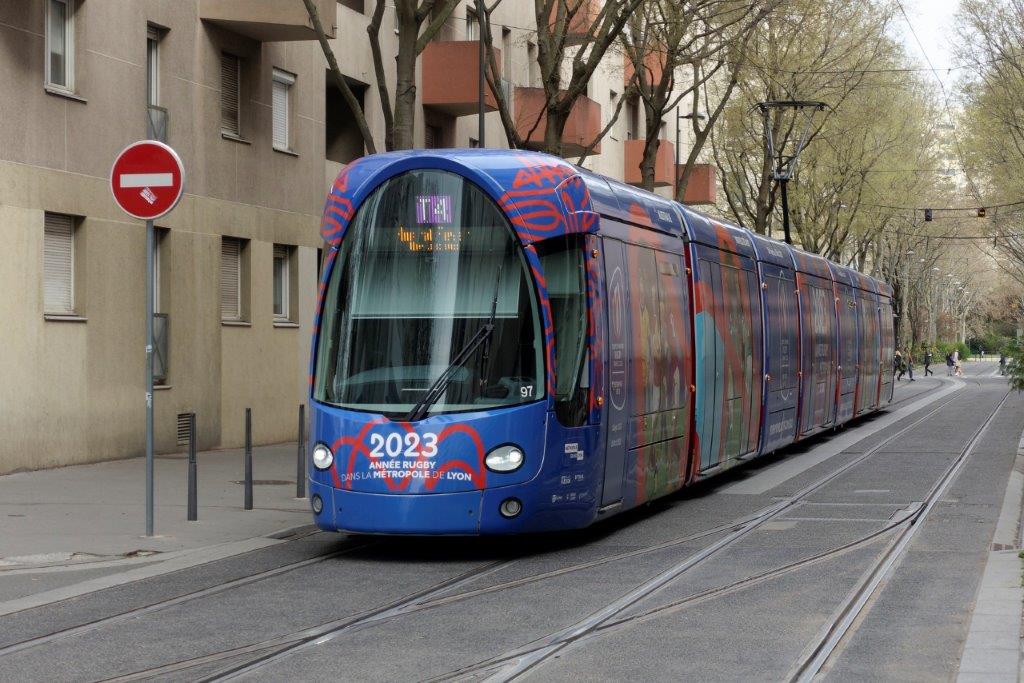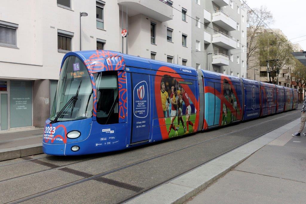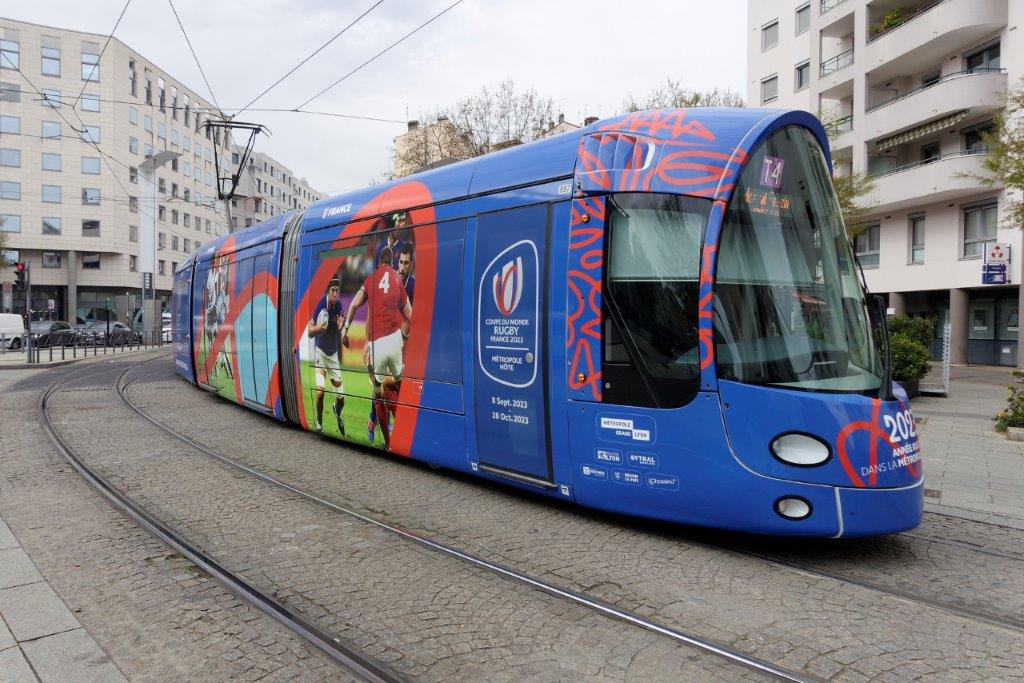 A ce titre, depuis le mardi 14 mars 2023, la rame 897 Citadis 402 NG Alstom, qui circule aussi bien sur la ligne T3 que sur la ligne T4 du réseau de tramways du Grand Lyon, a revêtu un pelliculage intégral fort réussi aux couleurs de la Coupe du Monde de Rugby 2023.