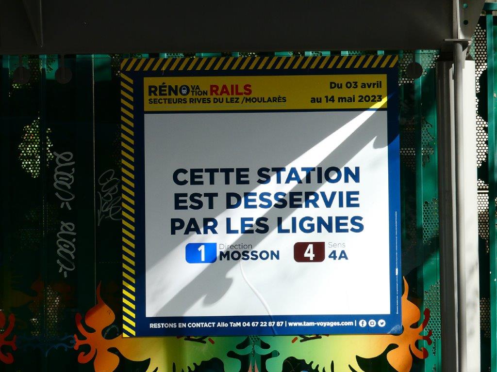 A Montpellier, en raison de travaux de remplacement de rails et appareils de voie sur le tronc commun des lignes 1 et 3 de tramway, entre le triangle de voies « Moularès (Hôtel de Ville) » et la place Ernest-Granier, du lundi 13 février au dimanche 2 avril 2023, puis sur le tronc commun des lignes 1, 3 et 4 de tramway, dont un reportage photo ci-après illustre la présente info, entre les stations « Rives du Lez – Consuls de Mer », propre à la ligne 3, et « Rives du Lez », commune aux lignes 1 et 2, ensemble d’une part, et le triangle de voies « Moularès (Hôtel de Ville) », d’autre part, du lundi 3 avril au dimanche 14 mai 2023, les rames opérant sur la ligne 1 ne desservent pas les stations « Rives du Lez », « Moularès (Hôtel de Ville) », « Port Marianne », « Mondial 98 », « Millénaire », « Place de France » et « Odysseum », terminus sud-est de la ligne 1, depuis le lundi 13 février 2023 et ce jusqu’au dimanche 14 mai 2023.
