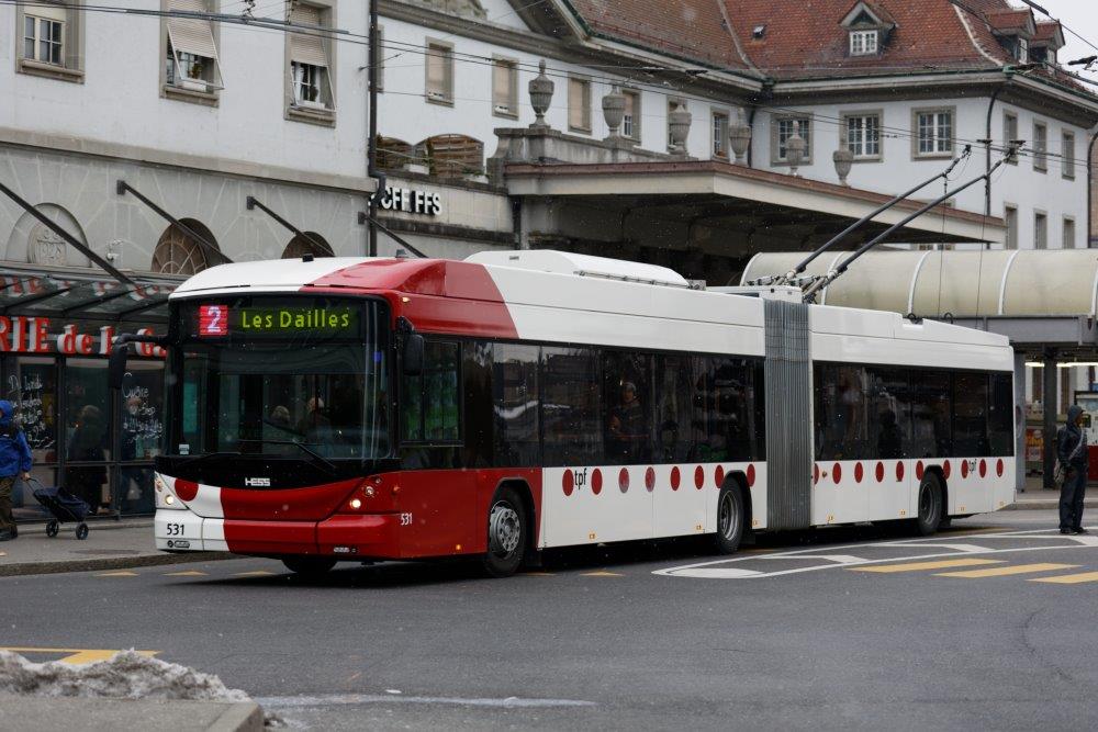 A Fribourg, le trolleybus 531 BGT-N2C Swisstrolley 3 du constructeur suisse Hess, opérant sur la ligne 2 en direction du terminus « Les Dailles », est photographié devant la gare SBB CFF FFS, le jeudi 21 février 2013. Copyright : bustramgeneve