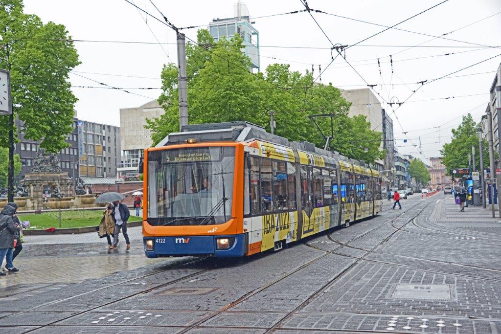 A Mannheim, la rame 4122 V6 Variobahn ADtranz, opérant sur la ligne 5 interurbaine à destination de Heidelberg, est photographiée à la hauteur de Paradeplatz, le samedi 30 avril 2022. Copyright : Thierry Leleu