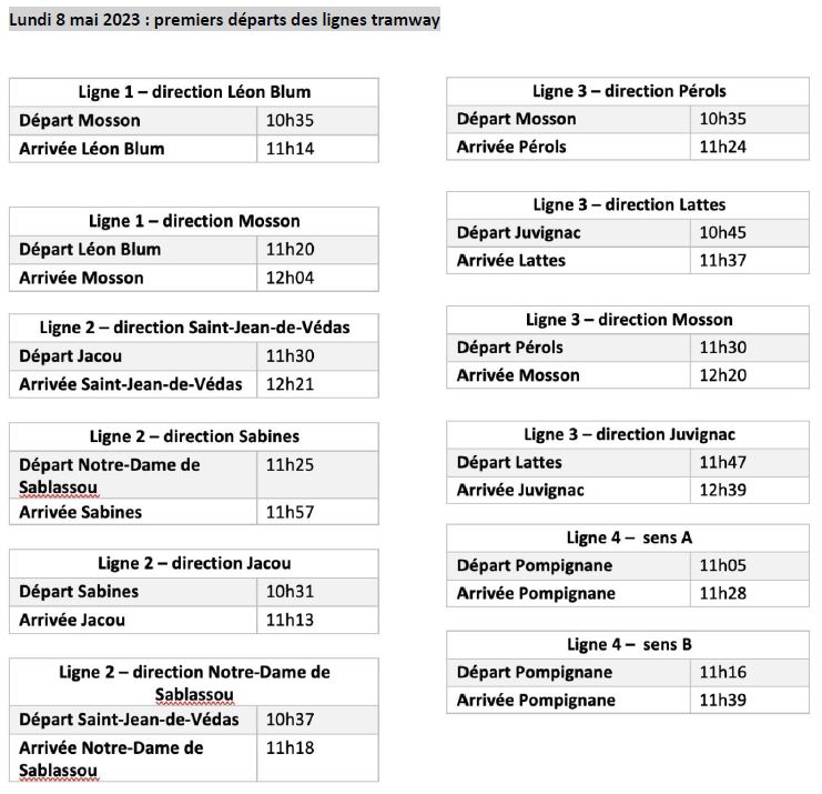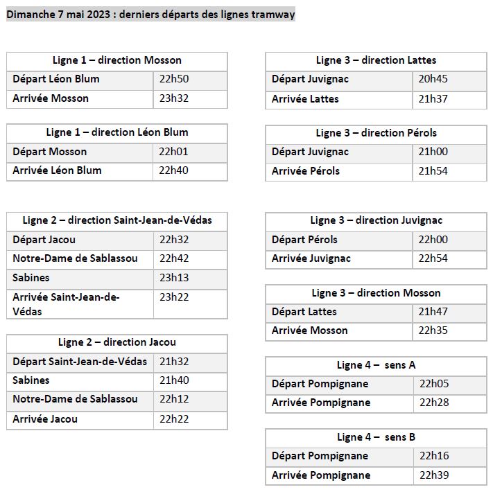 Horaires anticipés de fin de service dimanche soir 7 mai 2023 et horaires retardés de début de service lundi matin 8 mai 2023. Documents TaM Montpellier 3M