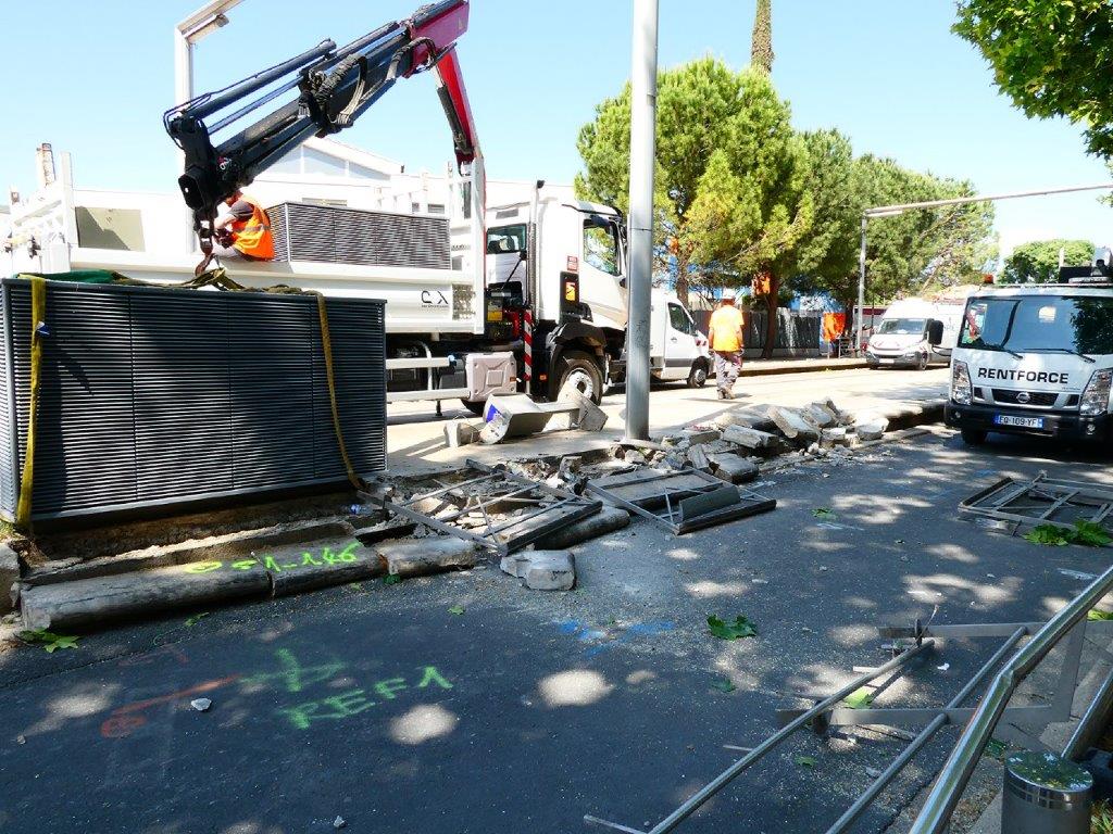 Avenue Emile-Bertin-Sans à Montpellier, le quai en bois de la station temporaire « Saint-Eloi CHU » devant faire office de terminus provisoire du tronçon nord-ouest de la ligne 1 du lundi 29 mai au vendredi 1er septembre 2023 inclus, était en cours de montage le samedi 27 mai 2023 en fin de matinée, date de la photo. Copyright : Edouard Paris