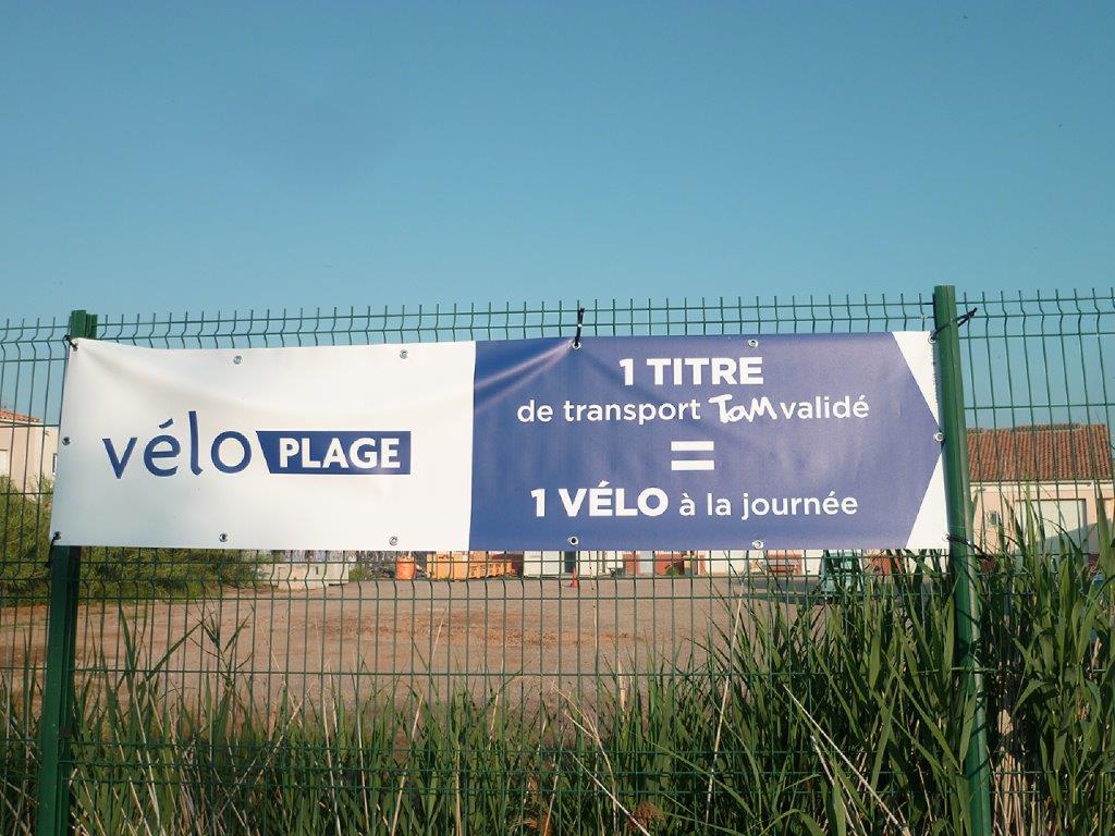 A Villeneuve-lès-Maguelone, photographie d’une banderole dédiée au service estival VéloPlage fixée à une clôture verte longeant l’avenue René-Poitevin sur laquelle vient se greffer l’impasse des Sycomores. Prise de vue en date du samedi 3 juin 2023. Copyright : Edouard Paris