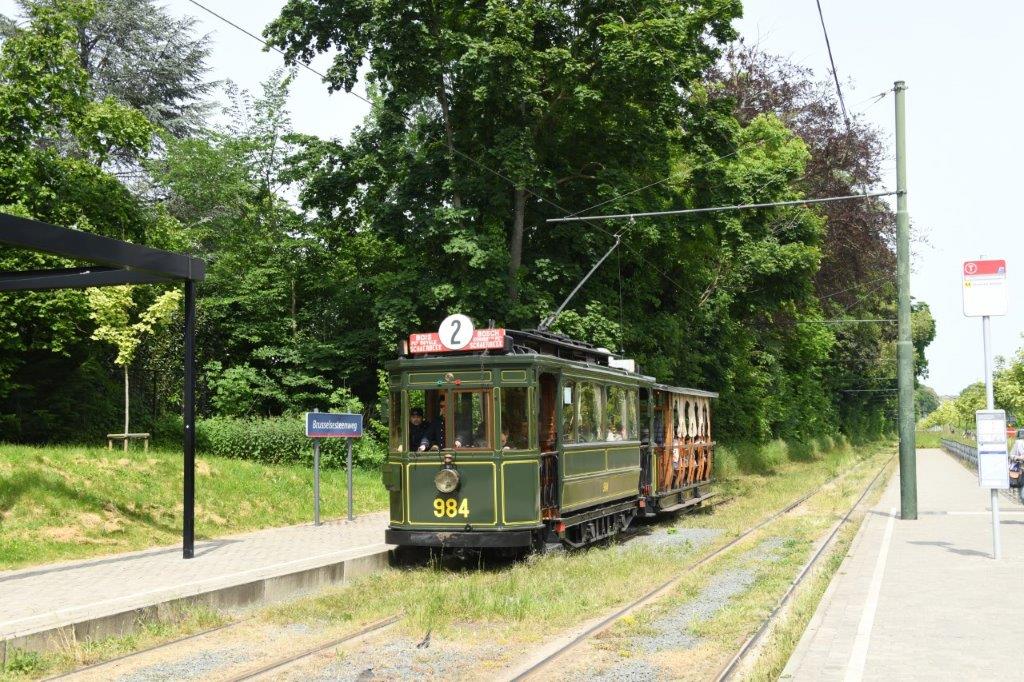 A Woluwe-Saint-Pierre, une composition formée par la motrice 1259 unidirectionnelle construite par les ateliers des « Tramways Bruxellois » en 1934 et la remorque ouverte 29 à deux essieux de type baladeuse construite par la Société Anonyme des Ateliers de Godarville en 1910, toutes deux pensionnaires du Musée du Transport Urbain Bruxellois, est photographiée au moment où elles arrive à la station « Madoux » commune aux lignes 39 et 44 du réseau de tramways de la Région de Bruxelles-capitale, le lundi 29 mai 2023, jour férié. Copyright : Thierry Leleu