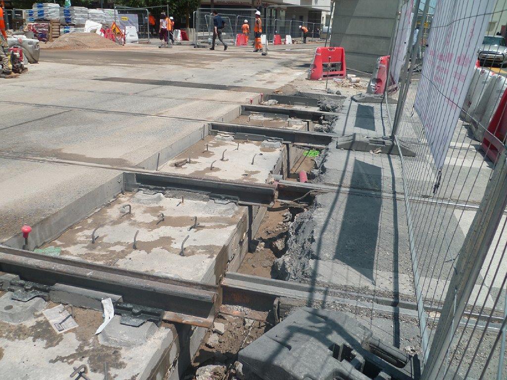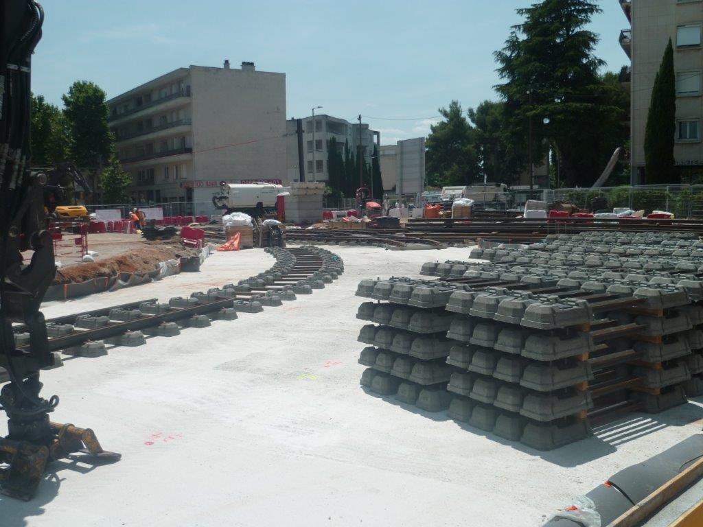 Les vedettes du samedi matin 24 juin devraient être quatre coupons de rail à gorge droits, dont deux sont déjà positionnés sur des brochets de traverses bi-blocs en béton armé auxquels ils devraient être définitivement fixés. Le troisième coupon de rail repose pour l’instant sur les entretoises métalliques de ces traverses bi-blocs avant d’être déplacé sur les brochets et le quatrième coupon de rail a été provisoirement placé parallèlement aux brochets sur lesquels il sera installé.
