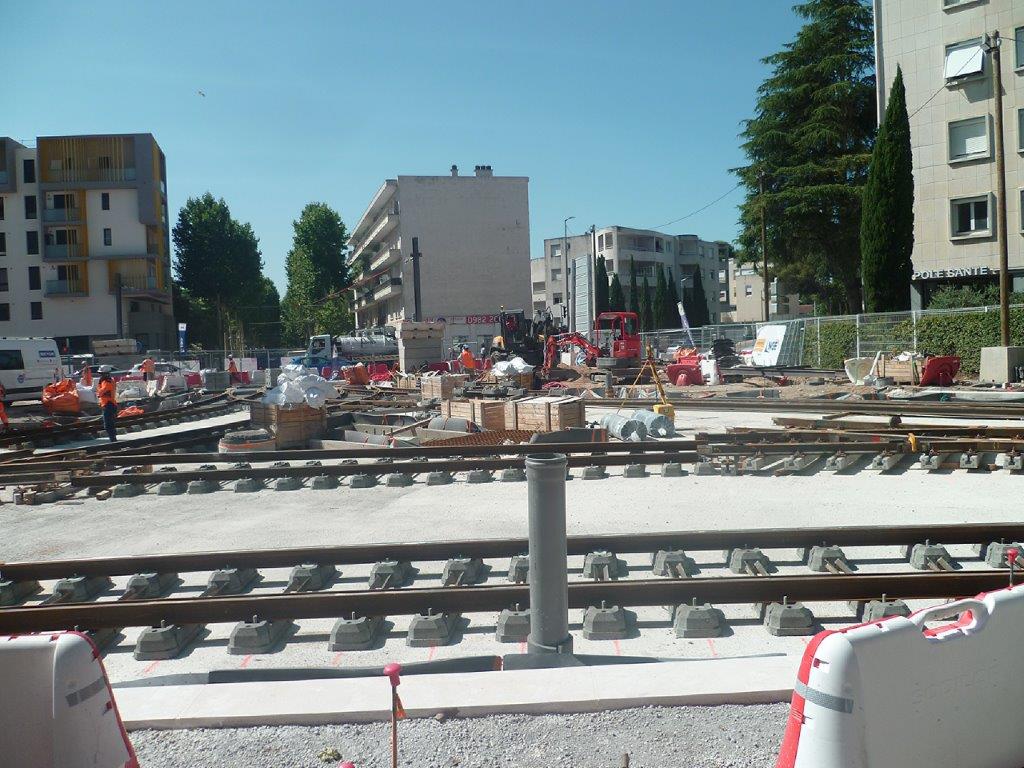 Dans le secteur Saint-Eloi à Montpellier, les travaux de la réalisation du triangle de voies de la bifurcation-jonction de la ligne 1 et de la future ligne 5 de tramway progressent à vue d’œil.
