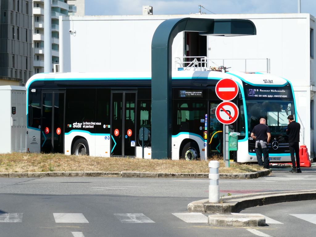 A Rennes, le bus 451 100 % électrique eCitaro standard Mercedes Benz, opérant sur la ligne 12 du réseau STAR, est photographié au moment où il est procédé à la recharge rapide de ses batteries sous une potence installée au terminus « Villejean – Université », le lundi 17 juillet 2023. Copyright : Edouard Paris