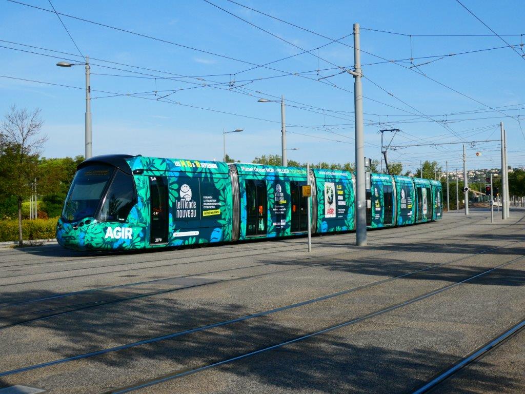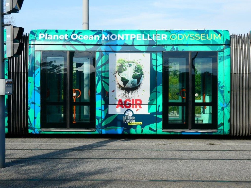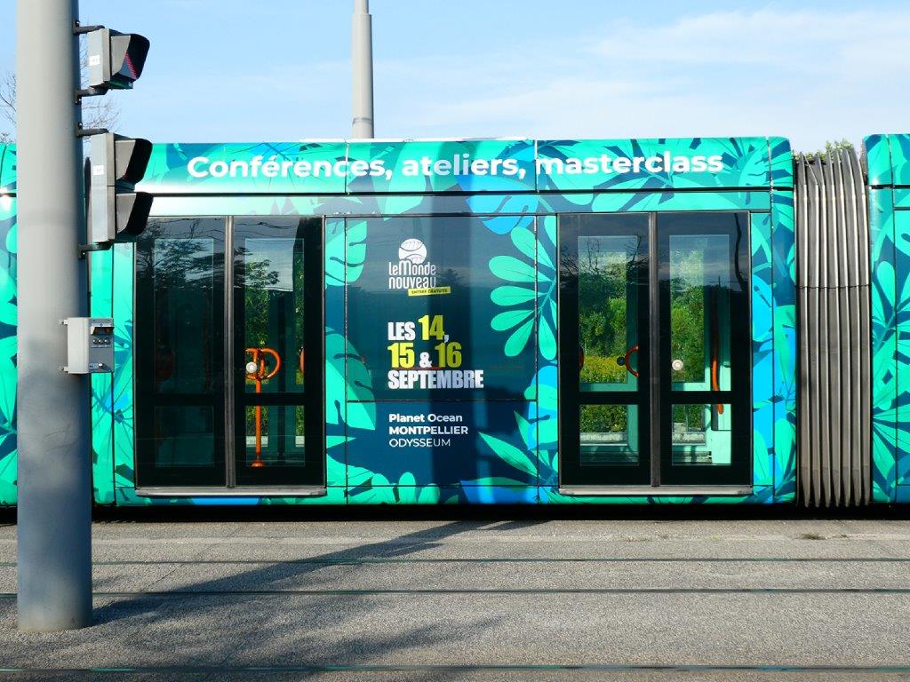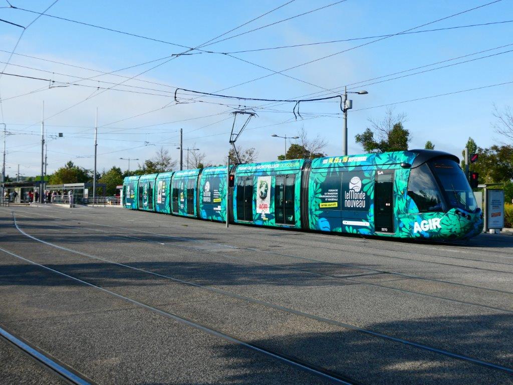 A Montpellier, la rame 2070 Citadis 402 Alstom multiligne vient de troquer la livrée intégrale Montpellier aime l’Europe à dominante bleue qu’elle a revêtue pendant trois mois, contre une livrée intégrale Forum le Monde Nouveau à dominante verte.