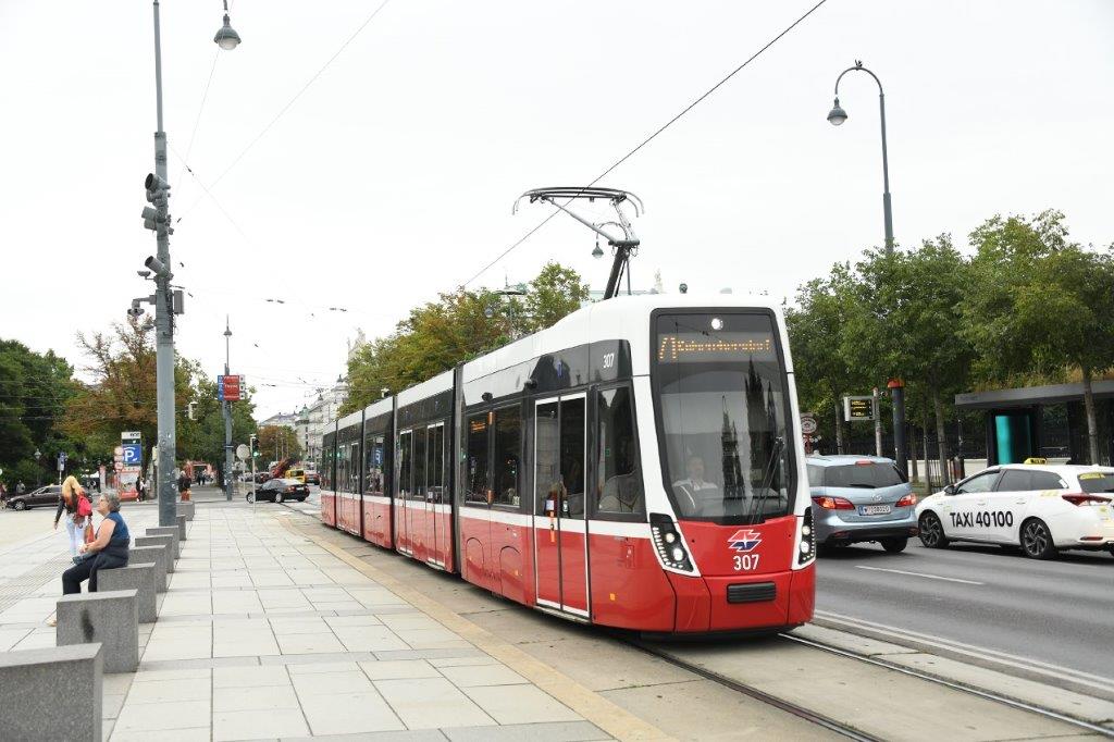 Doktor Karl Renner-Ring à Vienne, la rame 307 Flexity Wien type D Bombardier (année 2019), opérant sur la ligne 71 en direction du terminus « Kaiserebersdorf, Zinnergstraße », est photographiée sur le tronc commun des lignes 1, 2, 71 et D, entre les stations « Parlament » et « Ring, Volkstheater », le jeudi 3 août 2023. Copyright : Thierry Leleu
