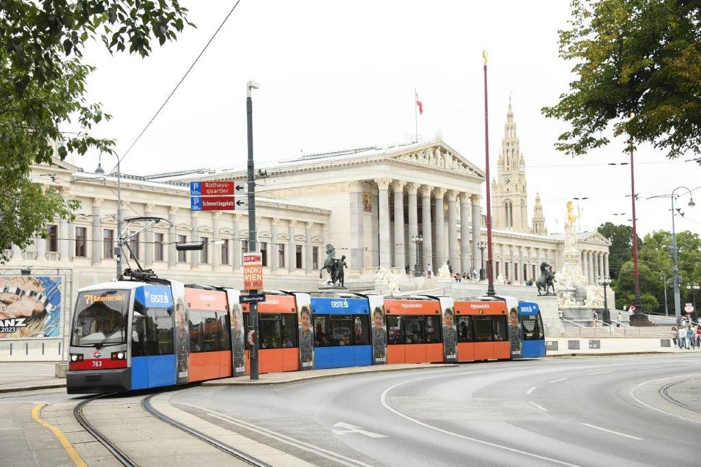 Karlplatz à Vienne, la rame 503 Flexity série 500 Alstom (année 2021) aux couleurs du Badner Bahn, circulant en direction du terminus « Wien Oper », est photographiée à l’approche de la station « Karlplatz », le mardi 8 août 2023. Copyright : Thierry Leleu