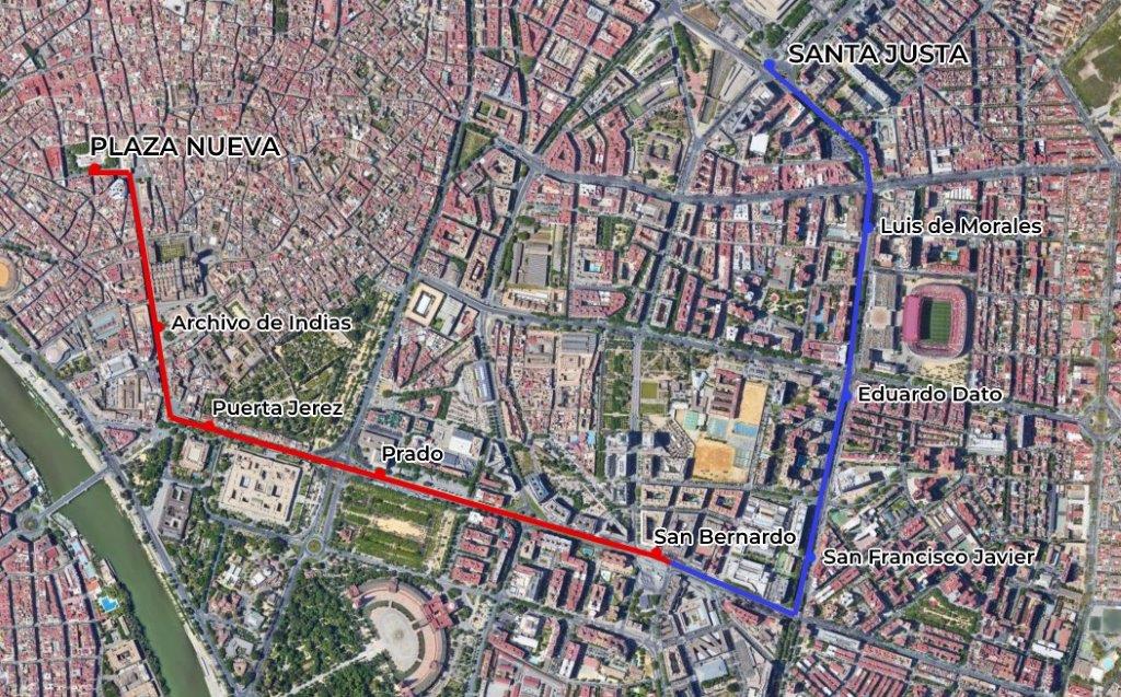 A Séville, l’unique ligne de tramway de 2,2 km de long, baptisée « Metrocentro », doit être prolongée de 2 km entre la station terminus « San Bernardo », au sud-est de la vieille ville, et la gare Santa Justa, desservie par les trains à grande vitesse, au nord du quartier Nervión.