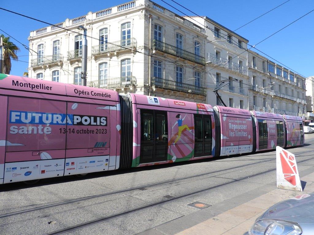 Depuis plusieurs jours déjà, la rame 2070 Citadis 402 Alstom multiligne est revêtue d’une livrée intégrale « FuturaPolis Santé », édition 2023, que l’on peut voir circuler aussi bien sur la ligne 1 que sur la ligne 3 du réseau de tramways de Montpellier.