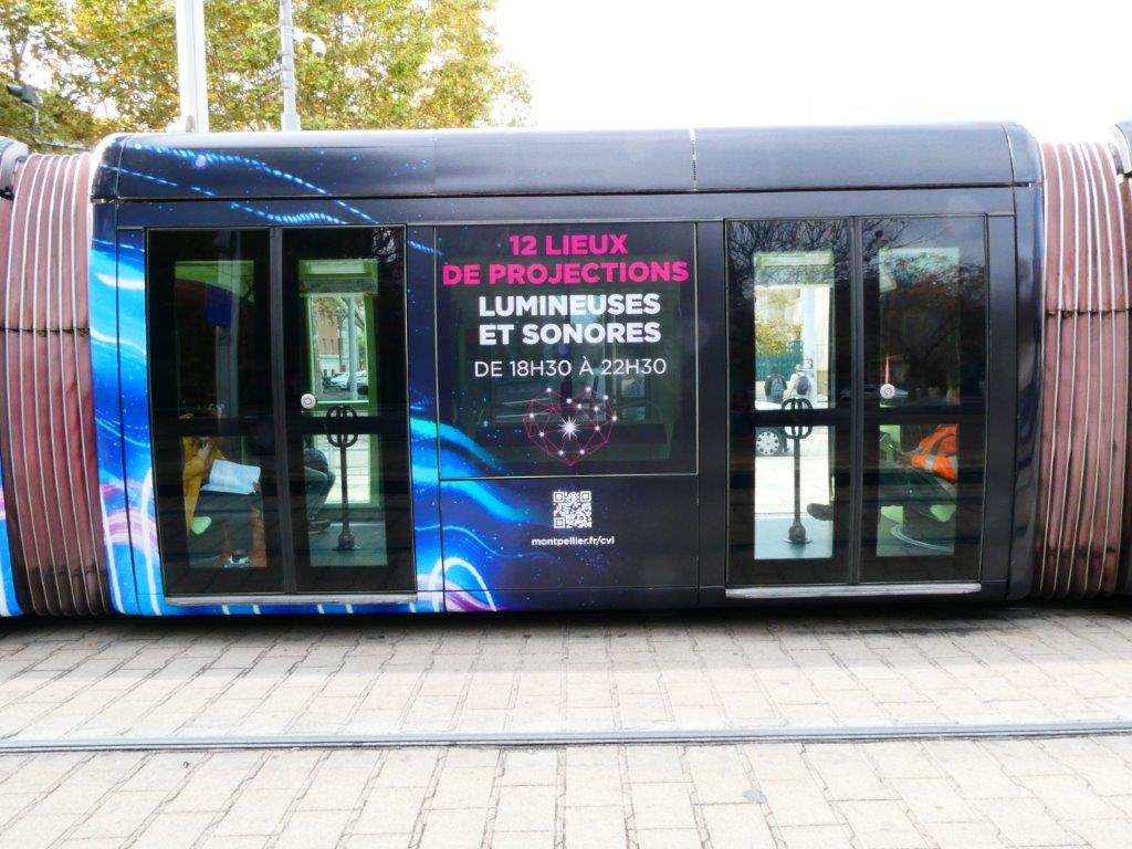 Sur le réseau de tramways de Montpellier, la rame 2048 Citadis 302 Alstom multiligne a revêtu un pelliculage annonçant la 8e édition de « Cœur de Ville en Lumières » qui se déroulera dans douze lieux en centre-ville de Montpellier du jeudi 16 au samedi 18 novembre 2023, de 18h30 à 22h30.