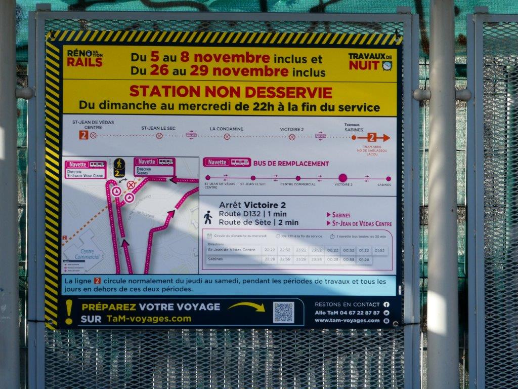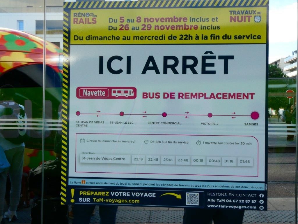 Une navette bus de remplacement est mise en place toutes les demi-heures entre « Sabines » et « Saint Jean de Védas Centre » et vice versa. Elle dessert au plus près les stations « Victoire 2 », « La Condamine » et « Saint Jean le Sec » toutes situées sur le territoire de la commune de Saint-Jean-de-Védas, entre 22h et 2h du matin environ, aux dates ci-dessus indiquées.