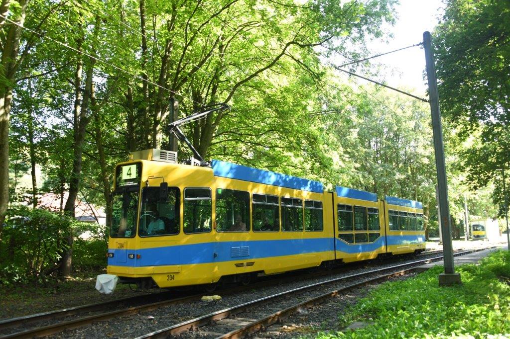 A Friedrichroda, la motrice bi-articulée 204 Be 4/8 Schindler/Siemens (ex-réseau BLT de Bâle (Suisse) année 1978 sous le type Be 4/6 puis sous le type Be 4/8 en 1995), opérant sur la ligne 4 en direction du terminus « Gotha Hauptbahnhof », est photographiée au moment où elle quitte la station « Reinhardsbrunn Bahnhof », le dimanche 10 septembre 2023. Copyright : Thierry Leleu