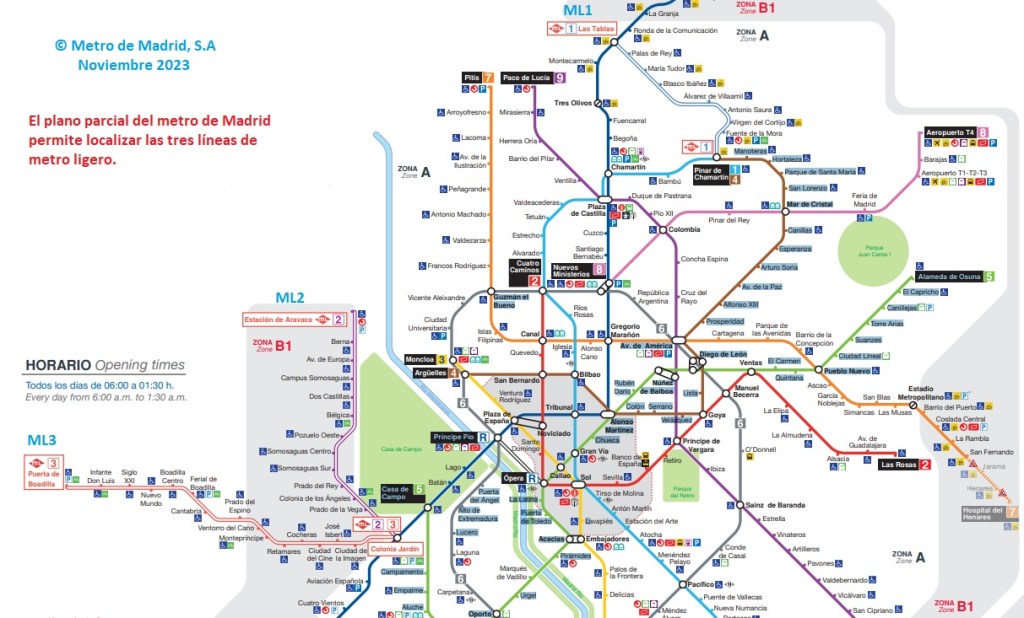 Plan partiel du métro de Madrid sur lequel figurent les lignes de métro léger ML1, ML2 et ML3. Copyright : Metro de Madrid, S.A – Novembre 2023