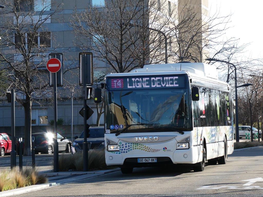 Boulevard Talabot à Nîmes, le bus 398 Urbanway 12 GNV IVECO Bus, opérant sur la ligne Tram’bus T4 en direction du terminus sud « Caissargues », est photographié à l’approche de la station « Gare Feuchères » commune aux lignes Tram’bus T2, T3 et T4 et aux lignes de bus 6, 7, 9, 10, 13, 14, 15, 32, 51, 52 et 61, le samedi 6 janvier 2024. En arrière-plan, on aperçoit le bus articulé 757 Citaro G C2 Mercedes-Benz circulant sur la ligne Tram’bus T2 Diagonal en direction du terminus ouest « CHU Carémeau » et l’arrière du BHNS 713 Exqui.City 24 GNC Hybrid Van Hool circulant sur la même ligne en direction du terminus est « Paloma », qu’il vient de croiser. Copyright : Edouard Paris