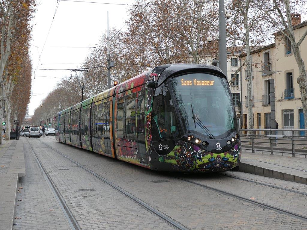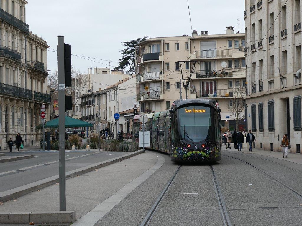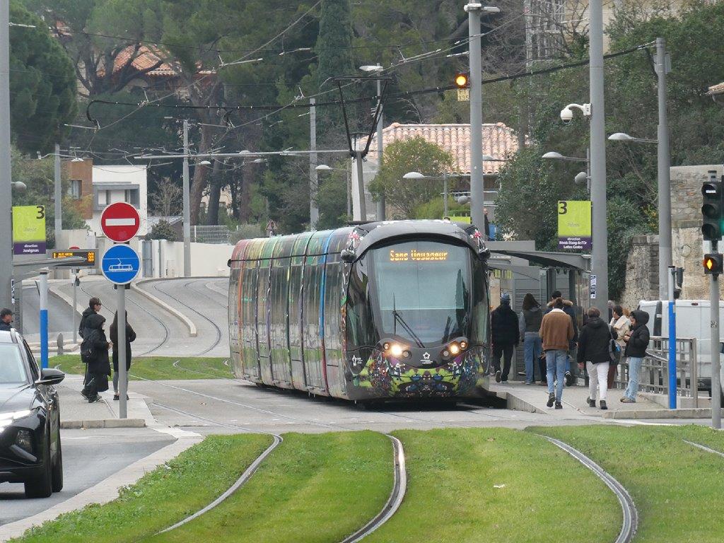 Ce lundi 29 janvier 2024, l’auteur de la présente info et des photos qui l’illustrent, a constaté que les conducteurs des rames en provenance de « Mosson » ou « Juvignac » recevaient l’autorisation de poursuivre leur chemin avec des voyageurs à bord entre les stations « Jules Guesde » et « Plan Cabanes », puis de rebrousser chemin depuis cette dernière station en direction de « Mosson » ou « Juvignac » en empruntant la voie 1 à contresens par laquelle ils arrivaient et ce sur 1,7 km jusqu’à la communication simple située en aval de la station « Jules Guesde », en desservant dans l’ordre les stations « Les Arceaux » et « Astruc » quais directions « Pérols – Etang de l’Or » et « Lattes Centre » et tout en marquant l’arrêt absolu avant de franchir chaque intersection avec une voie routière en l’absence d’une signalisation tramway spécifique à une circulation à contresens.