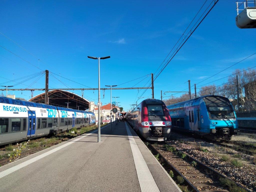 La gare SNCF d’Avignon Centre a la particularité d’être desservie par les trains TER Région Sud Zou ! (Provence-Alpes-Côte d’Azur) à gauche, liO Occitanie au centre-droit et Aura (Auvergne-Rhône-Alpes) à droite. Photo prise le samedi 3 février 2024. Copyright : Edouard Paris