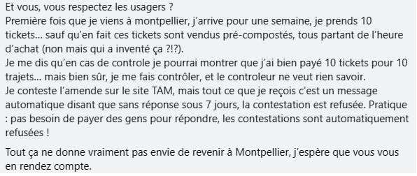 « J’étais sur Montpellier ces deux derniers jours et si la gratuité est bien pratique pour les habitants de la métropole, je trouve ça anormal de ne pas permettre l’achat des billets en physique. Les composteurs et les distributeurs sont retirés, les contrôles très très fréquents, et si on est de passage on n’a pas forcément le temps d’anticiper en téléchargeant l’appli et en s’embêtant avec un achat en ligne pas forcément pratique. »