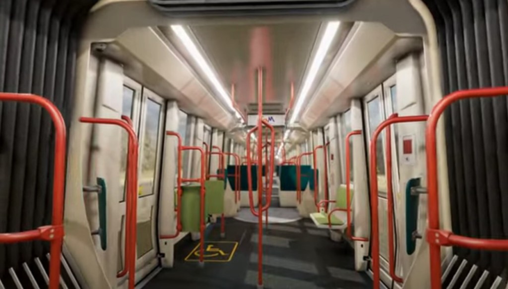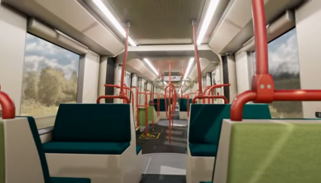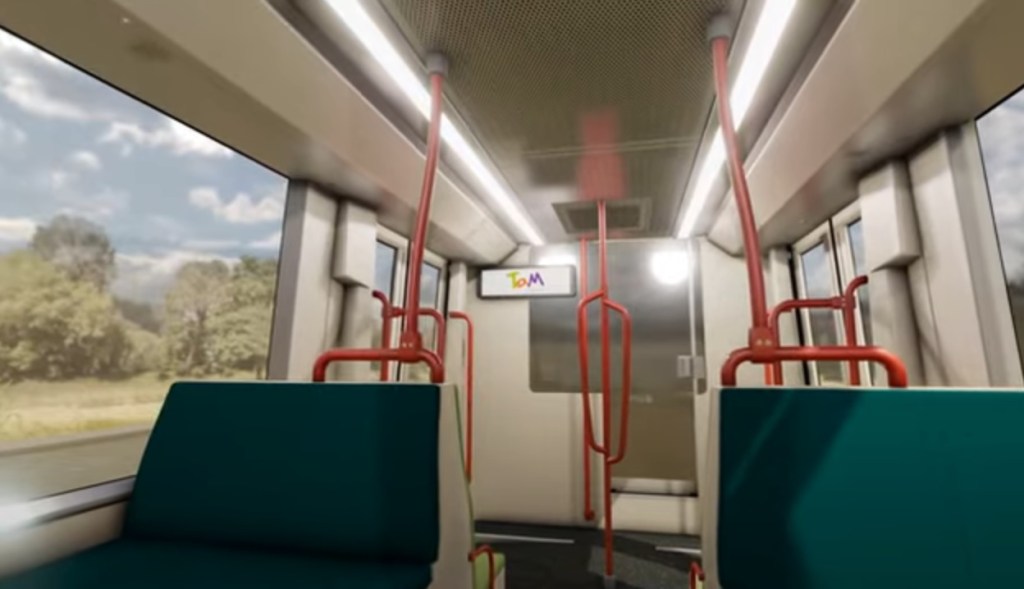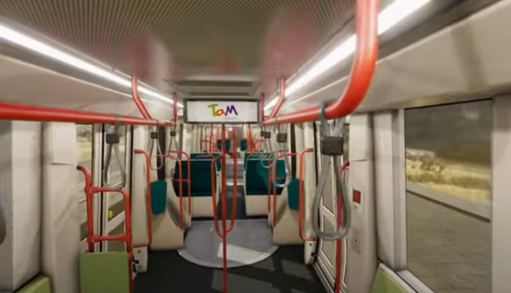 Aperçus de l’aménagement intérieur de l’espace voyageurs d’une des vingt-deux futures rames Urbos 100X CAF destinées à la future ligne 5 de tramway de Montpellier. Images tirées d’une vidéo YouTube mise en ligne par Montpellier Méditerranée Métropole et TaM, le vendredi 15 décembre 2023. Copyrights : Camille Besse et CAF