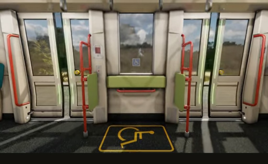 En attendant la réception de la première rame Urbos 100X CAF revêtue de la livrée « Feuille de vie », voici un aperçu de l’aménagement intérieur retenu pour l’ensemble des 60 rames commandées à ce jour, les couleurs des selleries et barres de soutien tant verticales qu’horizontales pouvant différer selon l’affectation des rames (ligne 5, ligne 1 et multiligne).