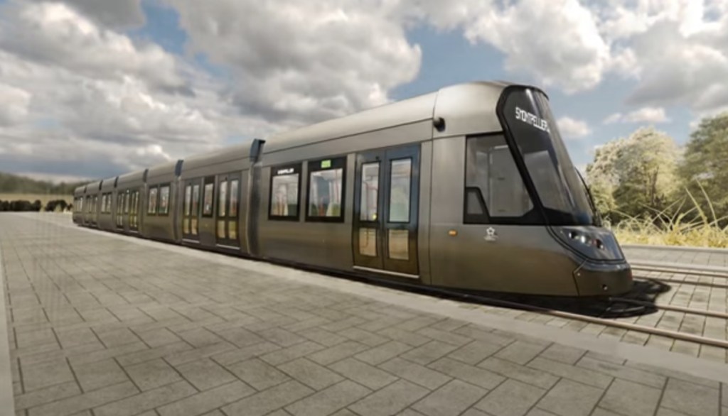 Aperçu de la livrée d’une future rame Urbos 100X CAF multiligne destinée au réseau de tramways de Montpellier. Image tirée d’une vidéo YouTube mise en ligne par Montpellier Méditerranée Métropole et TaM, le vendredi 15 décembre 2023. Copyrights : Camille Besse et CAF