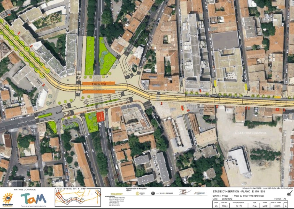 Etude d’insertion de la station « Place du 8 Mai 1945 » à Montpellier, figurant dans le dossier d’enquête publique du projet de la ligne 5 de tramway qui s’est déroulée au printemps 2013. Document TaM et Montpellier Agglomération – Octobre 2012
