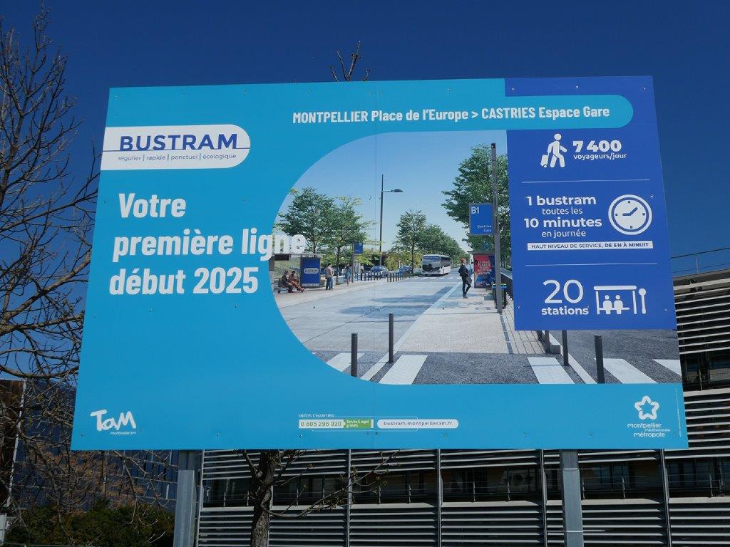 Panneau d’information installé en bordure du rond-point Benjamin-Franklin à Montpellier. Dans les faits, la ligne B1 de BusTram ouvrira en deux temps. Le visuel montre la future station « Eurêka » devant être implantée sur le boulevard Philippe-Lamour à Castelnau-le-Lez. Prise de vue en date du mardi 2 avril 2024. Copyright : Edouard Paris