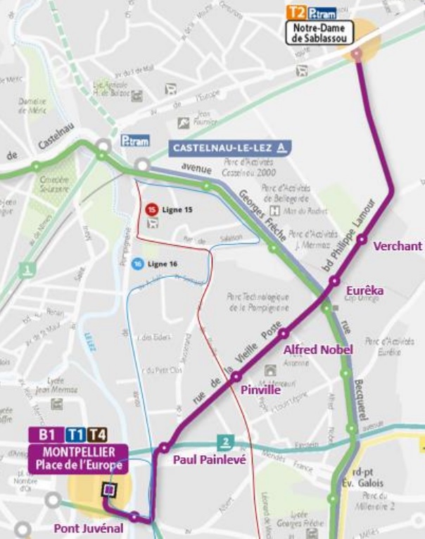 En séance ordinaire du Conseil de Métropole convoquée ce mardi matin 2 avril 2024, les conseillers métropolitains ont approuvé à l’unanimité la dénomination des huit stations, en ce compris les deux terminus, qui équiperont la future ligne B1 de Bustram sur son premier tronçon de 4,2 km, dont 2,9 km en site propre, reliant dans chaque sens le terminus sud-ouest « Place de l’Europe » à Montpellier au terminus provisoire nord-est « Notre-Dame de Sablassou » à Castelnau-le-lez, dont la mise en service est annoncée pour le début de l’année 2025.
