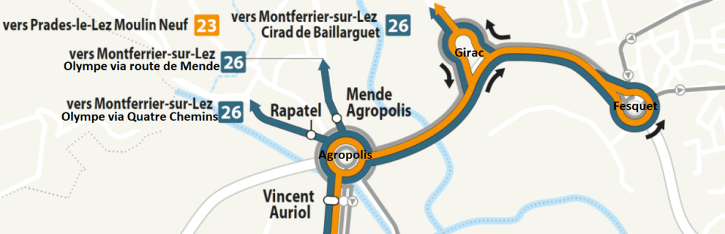 De même, à compter du lundi 8 avril 2024, les bus TaM Montpellier 3M opérant sur les lignes suburbaines 23 dans le sens « Occitanie » (Montpellier) – « Moulin Neuf » (Prades-le-Lez) et 26 dans le sens « Occitanie » (Montpellier) – « Cirad de Baillarguet » (Montferrier-sur-Lez), vont devoir faire le crochet de 1,5 km par le rond-point du Fesquet à Clapiers.