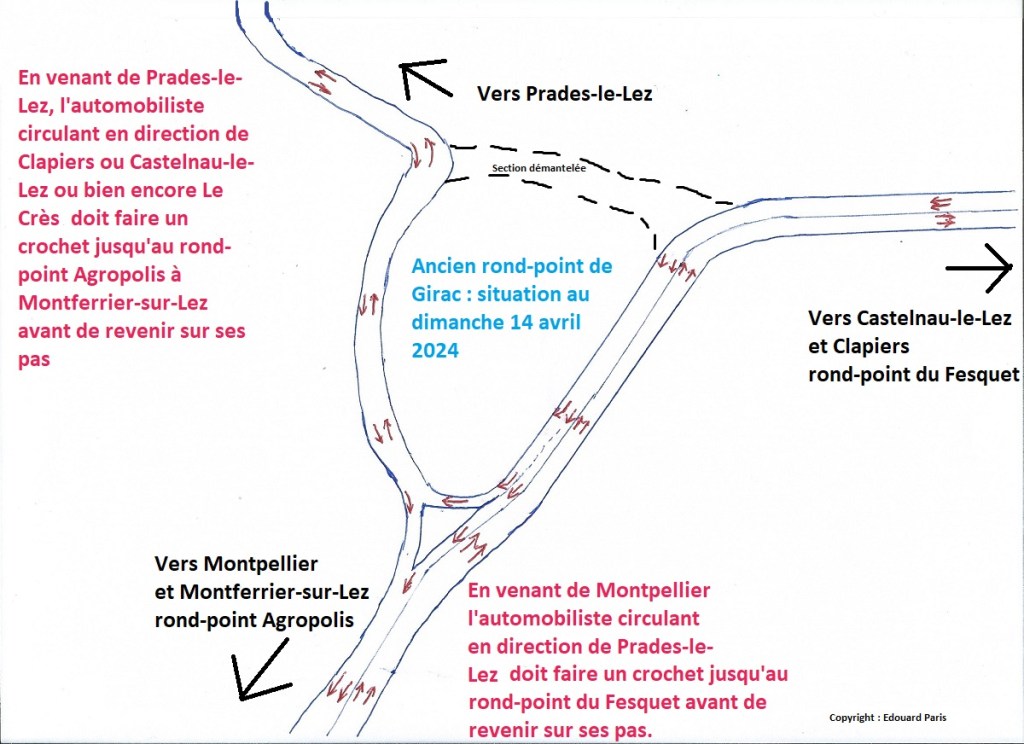 Les automobilistes ayant l’habitude de circuler entre Prades-le-Lez et Clapiers ou Castelnau-le-Lez ou bien encore Le Crès doivent faire un détour par le double giratoire Agropolis à Montferrier-sur-Lez avant de revenir sur leurs pas et les automobilistes ayant l’habitude de circuler entre Montpellier et Prades-le-Lez via le rond-point de Girac sont obligés de faire un détour par le rond-point du Fesquet à Clapiers avant de revenir là aussi sur leurs pas. Toutefois pour ces derniers, le crochet est bien plus long que prévu puisqu’ils doivent remonter jusqu’au niveau de la bifurcation sud de l’ancien rond-point avant de s’engager sur leur droite pour emprunter à contresens une des deux voies de la section ouest dudit ancien rond-point.