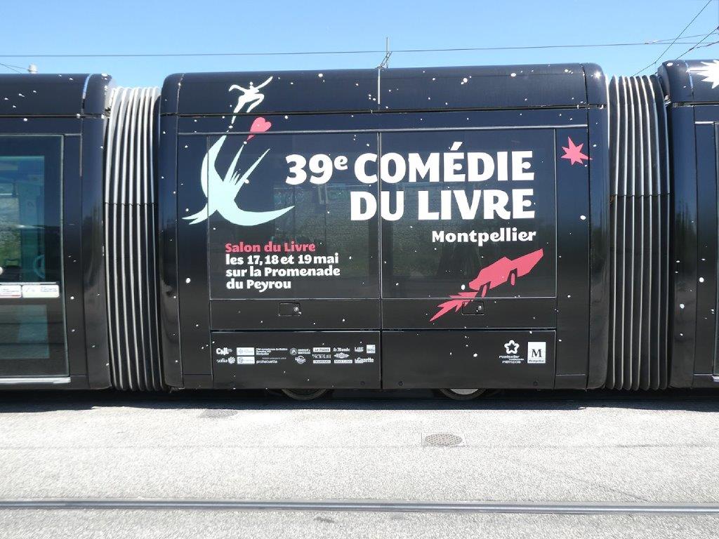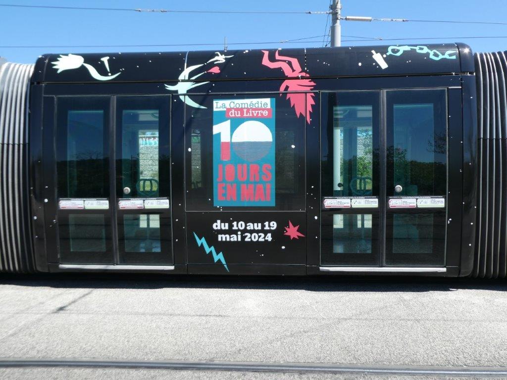 Depuis le début de la semaine, la rame 2099 Citadis 402 Alstom multiligne, qui opère aussi bien sur la ligne 1 que sur la ligne 3 du réseau de tramways de Montpellier, assure la promotion de la 39 édition de La Comédie du Livre – 10 jours en mai, qui se déroulera du vendredi 10 au dimanche 19 mai 2024.