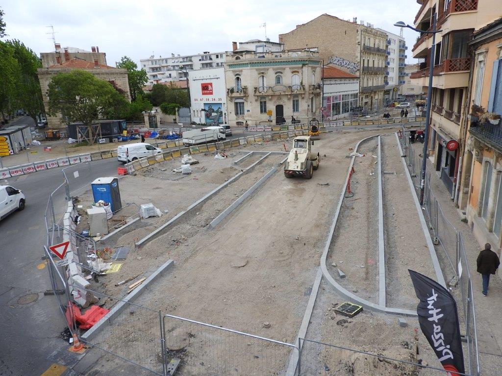Place du 8-Mai-1945, à 500 m à pied à l’ouest de l’endroit de la première soudure de rails, les travaux de réaménagement de cet ancien carrefour stratégique sont en cours. La pose de bordures laisse présager d’une diminution notable de l’espace réservé aux véhicules automobiles. C’est sur cette place et sous le pont de l’avenue de la Liberté que sera implantée la future station « Place du 8 Mai 1945 » propre à la future ligne 5.
